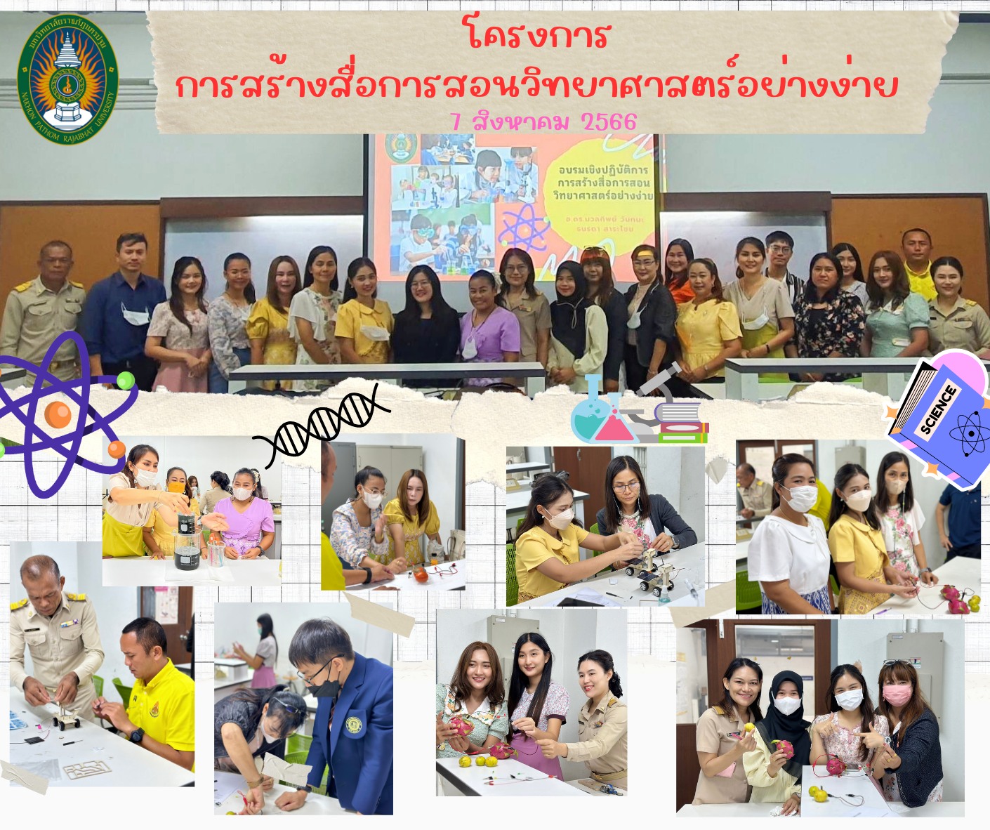 หน่วยศูนย์ส่งเสริมศักยภาพนักเรียนและครูความเป็นเลิศทางวิทยาศาสตร์ คณิตศาสตร์และเทคโนโลยี (ESMT) ได้จัดโครงการ "การสร้างสื่อการสอนวิทยาศาสตร์อย่างง่าย" วันที่ 7 สิงหาคม 2566 ณ ศูนย์วิทยาศาสตร์และวิทยาศาสตร์ประยุกต์ มหาวิทยาลัยราชภัฏนครปฐม โดยวิทยากร อ.ดร.นวลทิพย์ วันทนะ