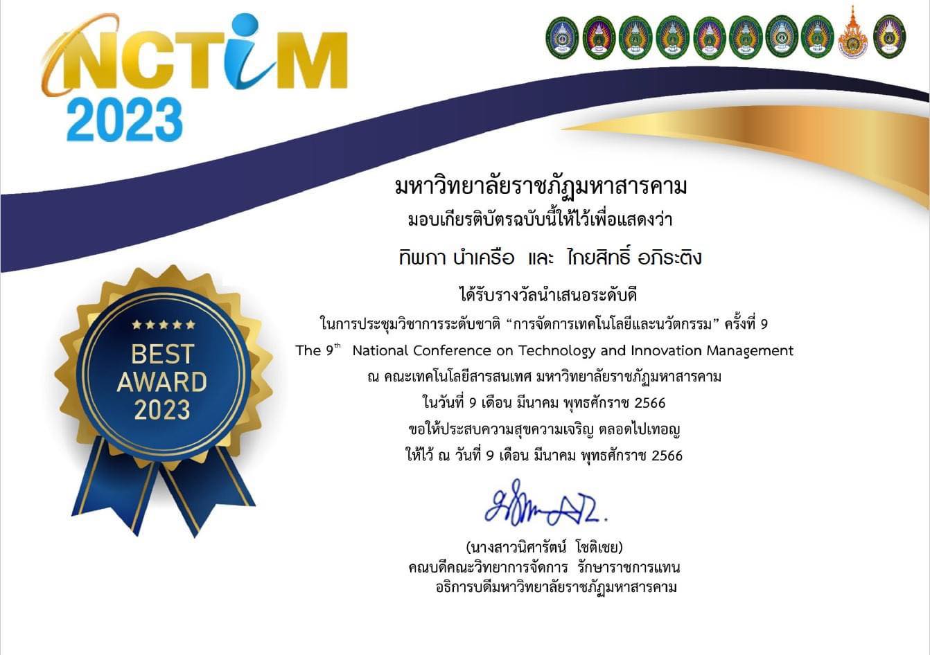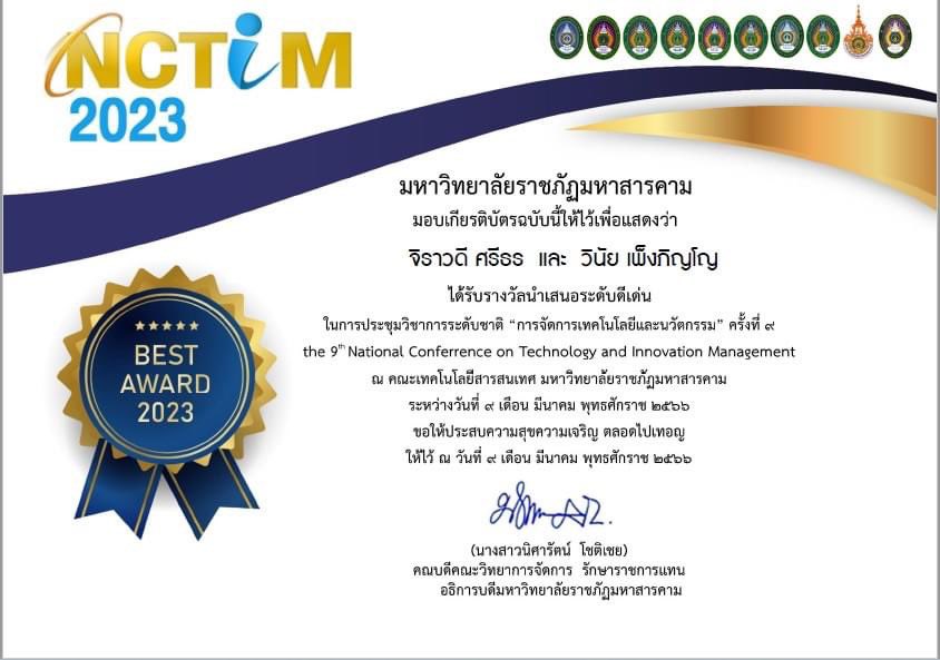 Certificate of Excellence and Outstanding Presentation of Computer Education to participate in the National Academic Conference on Technology Management and Innovation The 9th National Conference on Technology and Innovation Management (NCTIM 2023) was held on March 9, 2023 under the academic cooperation network of 10 Rajabhat Universities and 1 Rajamangala University, namely Mahasarakham Rajabhat University, Phra Nakhon Rajabhat University, Phetchaburi Rajabhat University Sisaket Rajabhat University, Nakhon Pathom Rajabhat University, Nakhon Ratchasima Rajabhat University Sakon Nakhon Rajabhat University, Buriram Rajabhat University Thepstri Rajabhat University, Surin Rajabhat University, and Rajamangala University of Technology Suvarnabhumi.