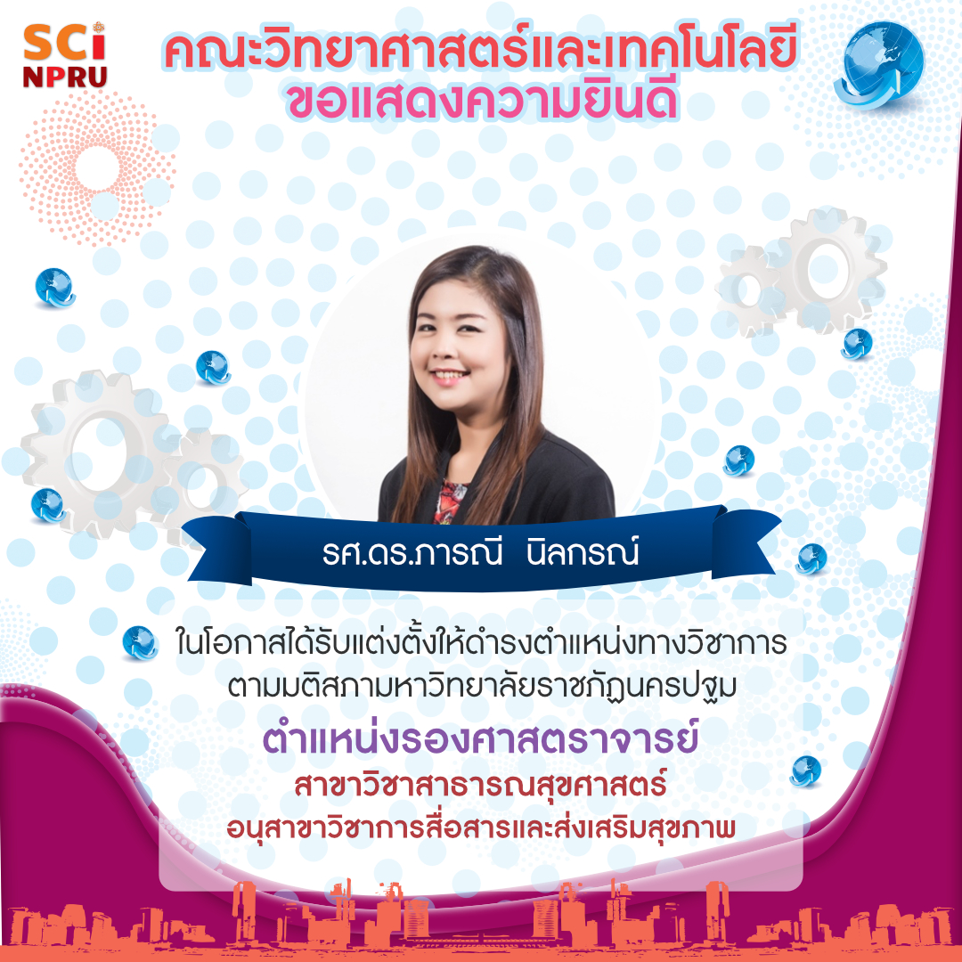 คณะวิทยาศาสตร์และเทคโนโลยี มหาวิทยาลัยราชภัฏนครปฐม ขอแสดงความยินดีกับ รองศาสตราจารย์ ดร.ภารณี นิลกรณ์ สาขาวิชาสาธารณสุขศาสตร์ คณะวิทยาศาสตร์และเทคโนโลยี ในโอกาสได้รับแต่งตั้งให้ดำรงตำแหน่งทางวิชาการ