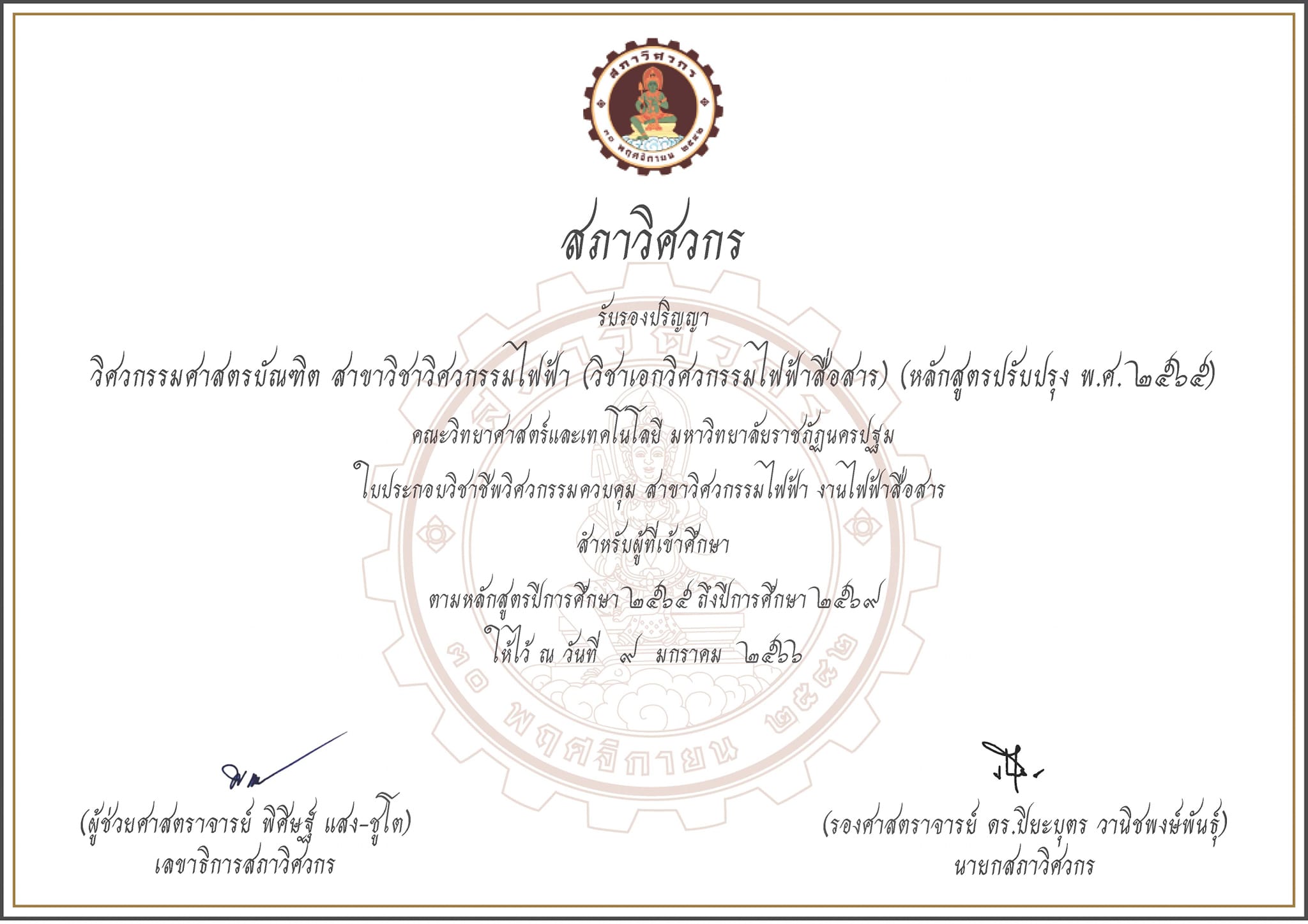 ขอแสดงความยินดีกับหลักสูตรวิศวกรรมศาสตรบัณฑิต (หลักสูตรปรับปรุง 2565) สาขาวิศวกรรมไฟฟ้า วิชาเอกวิศวกรรมไฟฟ้ากำลัง และ วิชาเอกวิศวกรรมไฟฟ้าสื่อสาร คณะวิทยาศาสตร์และเทคโนโลยี มหาวิทยาลัยราชภัฏนครปฐม ได้รับการรับรองหลักสูตรจากสภาวิศวกร